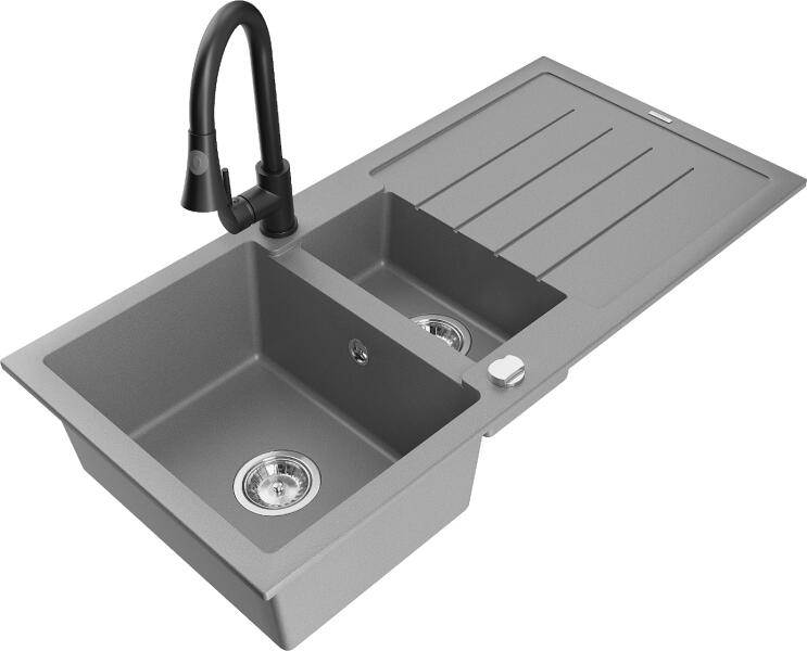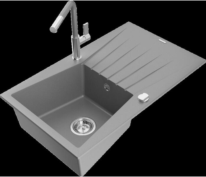 Mosogató: Gyártó: Mexen Sorozat: Andres Méretek: 1000x500x200 mm Kamra mélysége: 190 mm (nagyobb), 115 mm (kisebb) Kamra méretei: 430x330 mm (nagyobb), 340x170 mm (kisebb) Lefolyó átmérője: ø90 mm Típus: 1,5 kamrás csepegtetővel Típus: felülről az asztallapba való beágyazáshoz Anyaga: gránit (80% gránit adalékanyag + 20% gyanta) Túlfolyó nyílás: Igen Gyárilag előkész