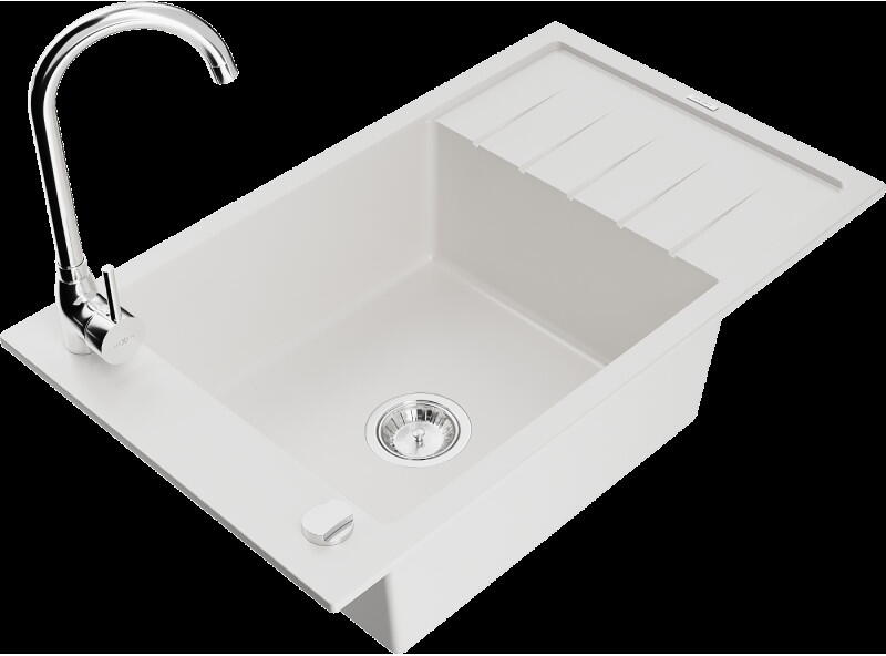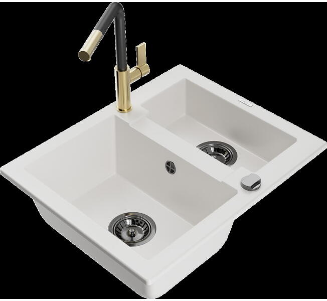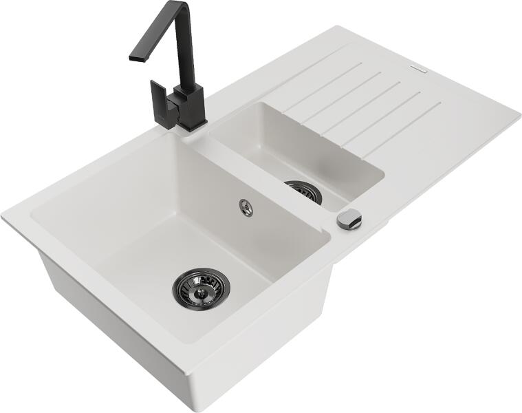 Mexen Matias, gránit mosogató 900x505x200 mm, 1,5 kamrás és fekete Rita csaptelep, fehér, 6502-20-670300-70 Gyártó: Mexen Sorozat: Matias Modell: 1,5-kamrás lefolyóval Beépítés: a munkalapba való beágyazáshoz Fehér szín Felület: sima Hossza 900 mm Szélesség 505 mm Magasság: 200 mm Kamra mélysége: 180 mm (nagyobb), 115 mm (kisebb) Kamra mérete: 435x335 mm (nagyobb), 345x150