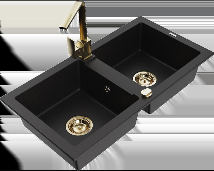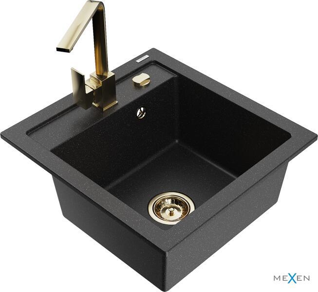 Mexen Vito, 1 kamrás gránit mosogató 520x490x210 mm, Rita arany csaptelep, fekete-ezüst metál, 6503-73-670300-50 Mosogató: Mérete: 520x490x210 mm Kamra mélysége: 200 mm Kamra méretei: 410x360 mm Lefolyó átmérője: ø90 mm Típus: 1 kamrás Típus: Az asztallapba süllyesztett Szín: fekete - ezüst metál Anyaga: gránit (80% gránit adalékanyag 20% gyanta) Túlfolyó nyílás: Igen
