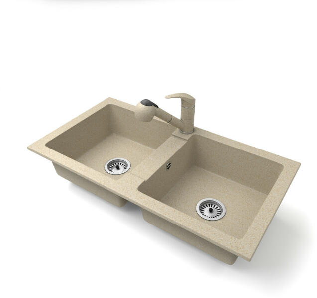 NERO Lybra gránit mosogatótálca homokbézs színben. Kétmedencés, szimmetrikus elrendezésű mosogató, a csaptelep számára kialakított lyukkal a medencék közötti felső pontban. Letisztult formatervezés, kiemelkedő anyagvastagság jellemzi, ezáltal rendkívük masszív és ellenálló konstrukció. Anyaga 80% gránit őrlemény és 20% akril, ami megfelel a szabvány gránit mosogat