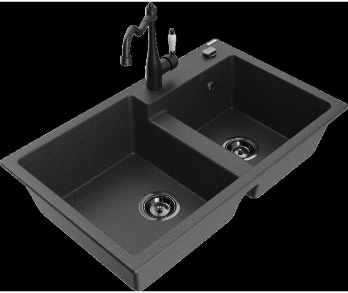 Mexen Mario, 2 kamrás gránit mosogató 820x436x161 mm és Telma fekete mosogató csaptelep, fekete foltos, 6504-76-670200-70-B Gyártó: Mexen Sorozat: Mario Termékkód: 6504822000-76 Szín: fekete foltos Mérete: 820x436x161 mm Kamra mélysége: 151 mm Kamra méretei: 356x336 mm Lefolyó átmérője: ø90 mm Típus: 2 kamrás Típus: a pultba süllyesztve Anyaga: gránit (80% gránit adalékan