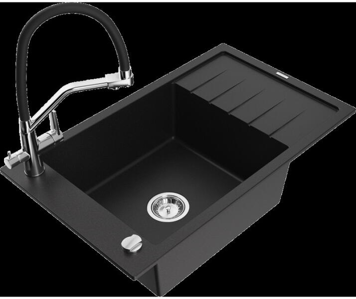 Mexen Kevin, gránit mosogató 586x458x190 mm, 1 kamrás és Savita mosogató csaptelep, fekete-ezüst metál, 6517-73-672601-50 Gyártó: Mexen Sorozat: Kevin Szín: fekete - ezüst metál Modell: 1 kamrás, rövid leeresztővel Beépítés: a munkalapba való beágyazáshoz Méretek: 586 x 458 x 190 mm Kamra mérete: 378 x 374 mm Kamra mélysége: 175 mm A lefolyó átmérője: Ø 90 mm Szifon +