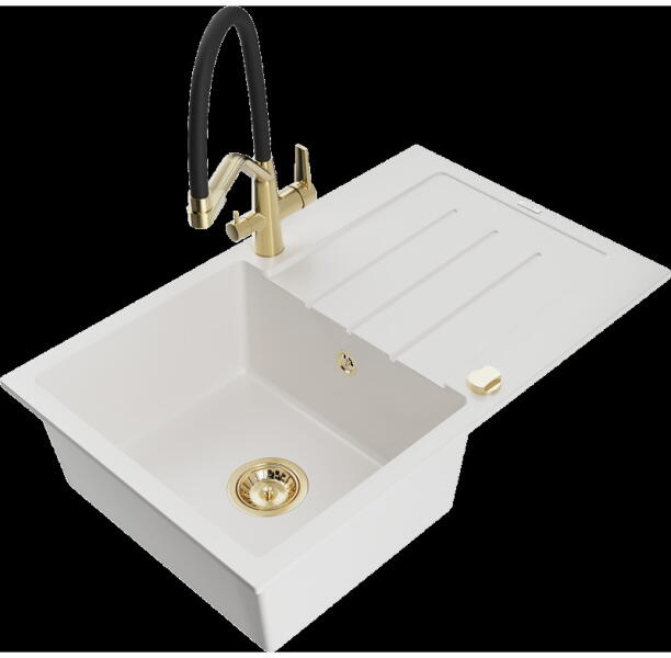 Mexen Cesar, 1 kamrás gránit mosogató csepptálcával 78x47 cm, konyhai csaptelep Telma, fehér, 6514-20-670200-00 Mosogató: Termékkód: 6514771010-20 Mérete: 775x470x200 mm Kamra mélysége: 180 mm Kamra méretei: 410x355 mm Lefolyó átmérője: ø90 mm Típus: 1 kamrás csepptálcával Típus: Az asztallapba süllyesztett Fehér szín Anyaga: gránit (80% gránit adalékanyag 20% gyanta)