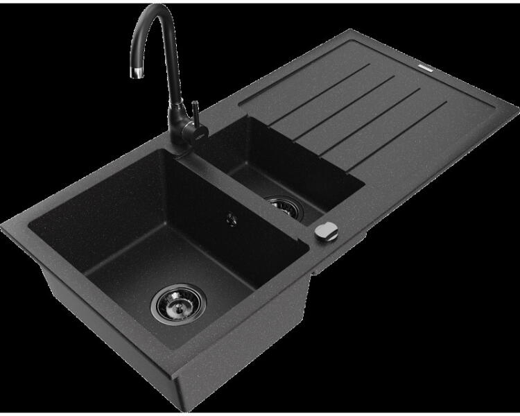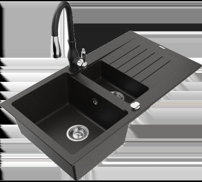 Mexen Kevin, gránit mosogató 586x458x190 mm, 1 kamrás és Rita króm csaptelep, fekete - ezüst metál, 6517-73-670300-00 Gyártó: Mexen Sorozat: Kevin Modell: 1 kamrás, rövid leeresztővel Felszerelés: munkalapra Hossza 586 mm Szélesség 458 mm Magasság: 190 mm Kamra mérete: 378x374 mm Kamra mélysége: 175 mm A lefolyó átmérője: Ø 90 mm Szifon + automatikus leeresztő csavar Anyag