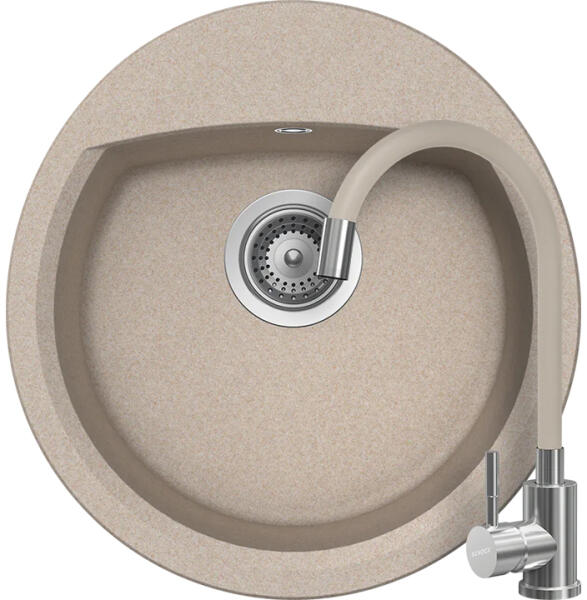 Schock Manhattan R-100 konyhai mosogatótálca Cristalite Sabbia 470 x 490 mm, gránit, hagyományos beépítés, homok munkalapba beépíthető, egymedencés, csepegtető nélküli, ideálisan illeszkedik a minimum 45 cm-es alsószekrényhez. A csaptelep helye előre elkészített, könnyedén áttörhető. A csomagban találja a használati útmutatót, amely részletes leírást ad a csaptelep