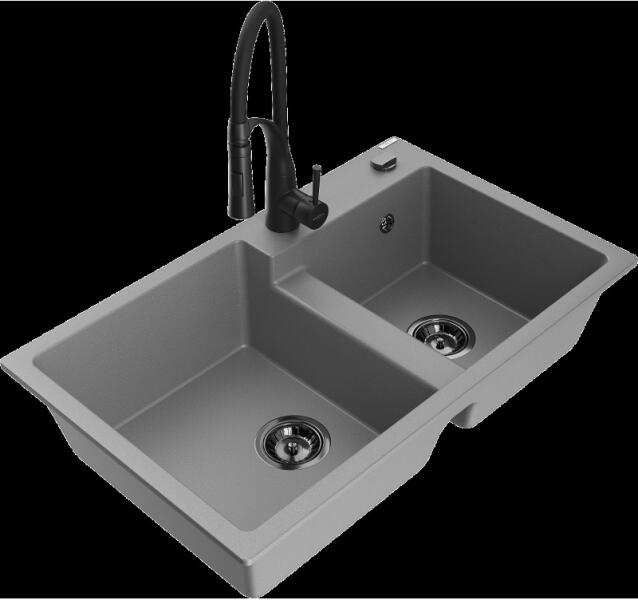 Mexen Tomas, gránit mosogató 800x500x190 mm, 2 kamrás és fekete Telma csaptelep, fekete, 6516-77-670200-70-B A konyhai mosogató műszaki adatai: Gyártó: Mexen Sorozat: Tomas Modell: 2-kamrás csepptálca nélkül Felszerelés: munkalapra Fekete szín Felületkezelés: sima Hossza 800 mm Szélesség 500 mm Magasság: 190 mm Kamra mélysége: 180 mm (nagyobb), 180 mm (kisebb) Kamra mérete: