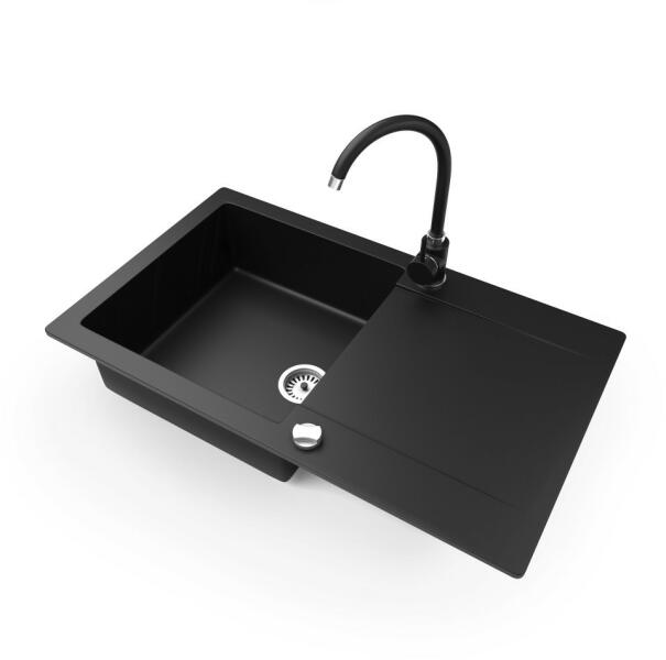 NERO Gold gránit mosogató matt fekete színben. Praktikus kialakítású egymedencés mosogató, kellő méretű csepegtető résszel. Modern letisztult formájával egy modern konyha tökéletes része lehet. Különlegessége hogy a csepegtető rész nem bordázott, így a minimál stílusú konyhákba is nagyszerű választás. A mosogatón 2 lyuk található ezáltal a mosogató lehet jobb v