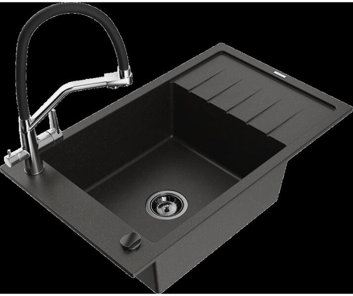 Mexen Bruno, 1 kamrás gránit mosogató lefolyóval 795x495x200 mm, fekete Duero csapteleppel, fekete-arany metál, 6513-75-671600-70 Mosogató: Mérete: 795x495x200 mm Kamra mélysége: 190 mm Kamra méretei: 440x360 mm Lefolyó átmérője: ø90 mm Típus: 1 kamrás csepegtetővel Típus: a munkalapba süllyesztve Szín: fekete - arany metál Anyaga: gránit (80% gránit adalékanyag 20% gyanta
