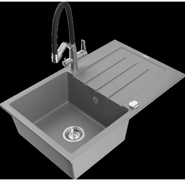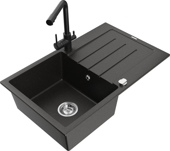 Mexen Cesar, gránit mosogató 775x470x190 mm, 1 kamrás és Duero króm csaptelep, fekete foltos, 6514-76-671600-00 A konyhai mosogató műszaki adatai: Gyártó: Mexen Sorozat: Cesar Modell: 1 kamrás Felszerelés: munkalapra Szín: fekete foltos Felület: sima Hossza 775 mm Szélesség 470 mm Magasság: 190 mm Kamra mélysége: 180 mm Kamra mérete: 410x355 mm Lefolyó átmérője: 90 mm Szifon