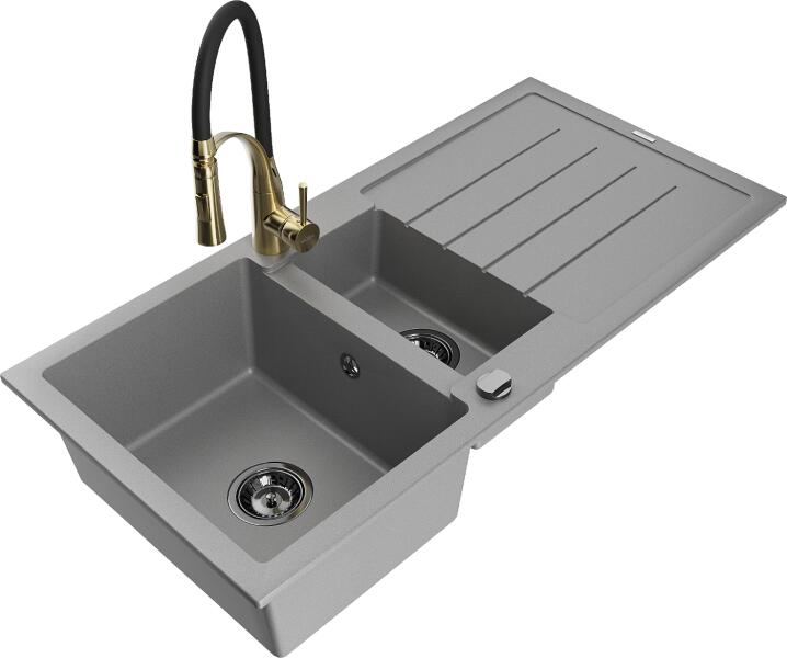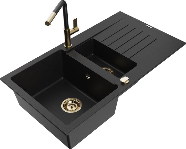 Mosogató: Gyártó: Mexen Sorozat: Andres Méretek: 1000x500x200 mm Kamra mélysége: 190 mm (nagyobb), 115 mm (kisebb) Kamra méretei: 430x330 mm (nagyobb), 340x170 mm (kisebb) Lefolyó átmérője: ø90 mm Típus: 1,5 kamrás csepegtetővel Típus: felülről az asztallapba való beágyazáshoz Anyaga: gránit (80% gránit adalékanyag + 20% gyanta) Túlfolyó nyílás: Igen Gyárilag előkész