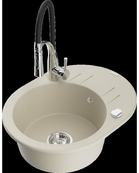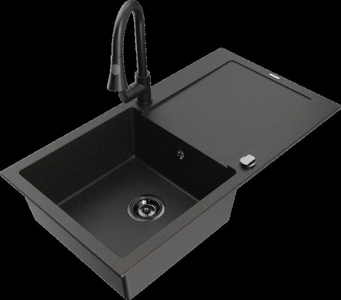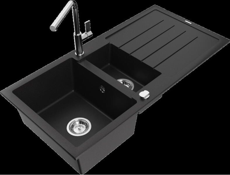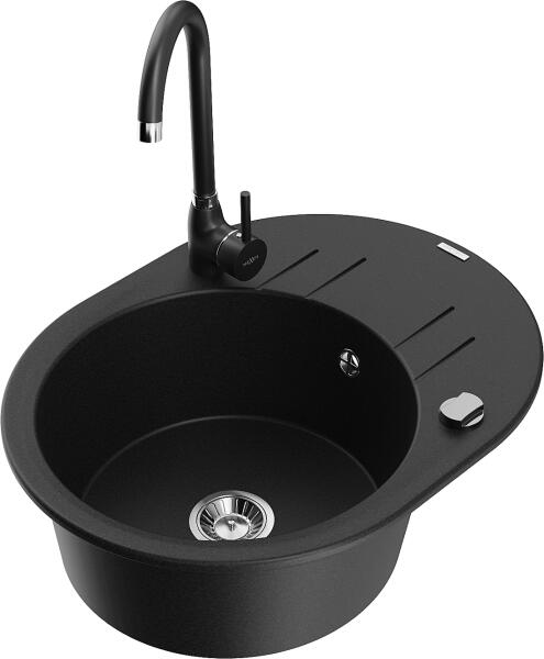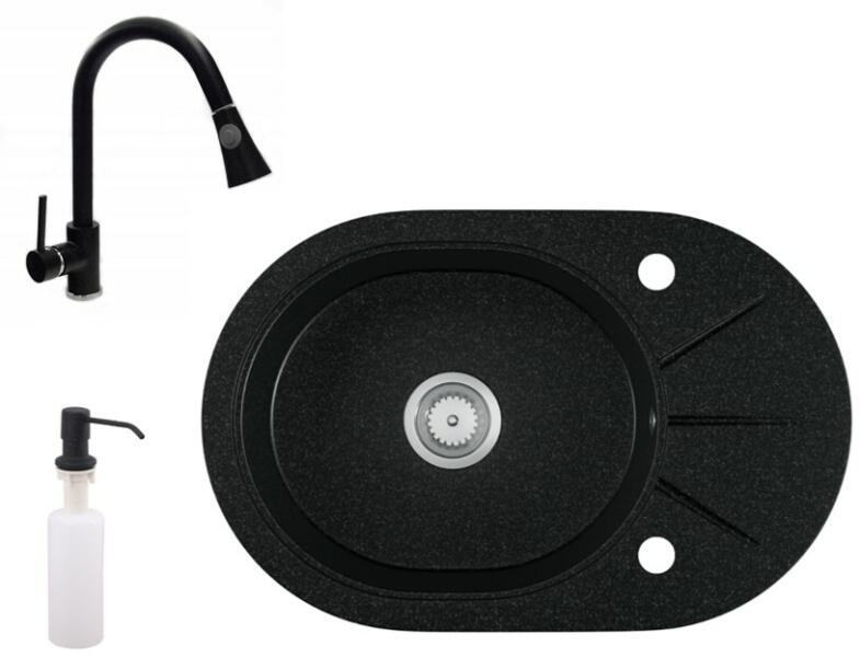 Laneo ZIA gránit mosogató szett fekete színben. Teljes készlet, ami tartalmazza a magasított csaptelepet, a beépített mosogatószer adagolót és a szifon készletet. Ovális kialakítású, egyedi megjelenésű mosogató, méretes, 44,5 x 37 cm-es medencével, ami 19 cm mély. Egyszerre stílusos és kiválóan alkalmas nagyobb edények mosogatására is. CSOMAG TARTALMA: - Gránit mosogat