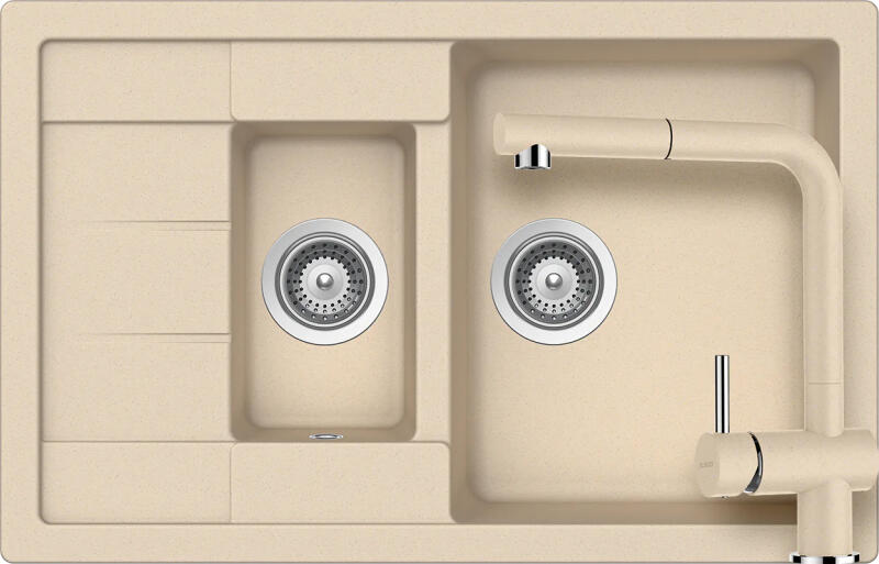 Mexen Tomas, gránit mosogató 800x500x190 mm, 2 kamrás és fekete csaptelep Duero, bézs, 6516-69-671600-70 A konyhai mosogató műszaki adatai: Gyártó: Mexen Sorozat: Tomas Modell: 2-kamrás csepptálca nélkül Felszerelés: munkalapra Szín: bézs Felületkezelés: sima Hossza 800 mm Szélesség 500 mm Magasság: 190 mm Kamra mélysége: 180 mm (nagyobb), 180 mm (kisebb) Kamra mérete: 440