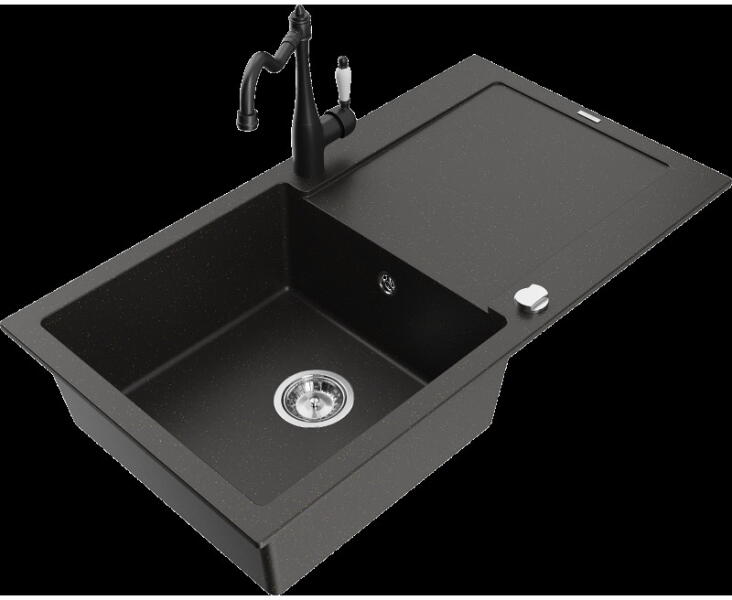 Gyártó: Mexen Sorozat: Cesar + Carla Mosogató: Fekete szín Méretek: 775x470x200 mm Kamra méretei: 410x355 mm Kamra mélysége: 180 mm Lefolyó átmérője: ø90 mm Típus: 1 kamrás lefolyóval Mosogató típusa: a munkalapba való beágyazáshoz Anyaga: gránit (80% gránit adalékanyag 20% gyanta) Túlfolyó nyílás: Igen Lyukak: 2 (1 lyuk a mosogató csaptelepéhez, 1 lyuk az automatikus