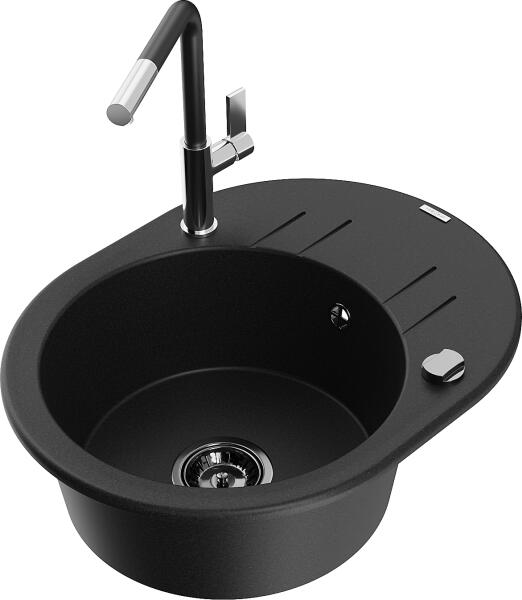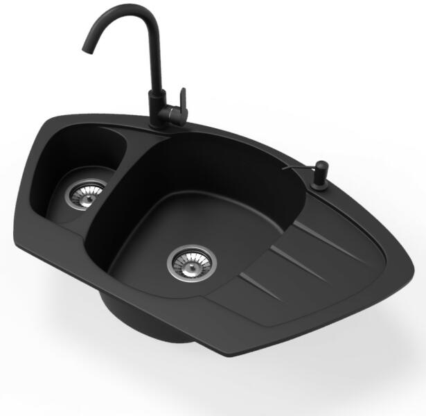 NERO Compact sarok gránit mosogató, ami egyben praktikus és impozáns látványelem is a konyhában. Tökéletes választás azokba a konyhákba, ahol a mosogató rész a sarokban lett kialakítva. Íves, de modern formatervezése nagyszerűen illik bármilyen stílusú konyhába. A mosogatón 2 lyuk lett kialakítva, egy a csaptelepnek és egy a beépíthető mosogatószer adagolónak vagy aut