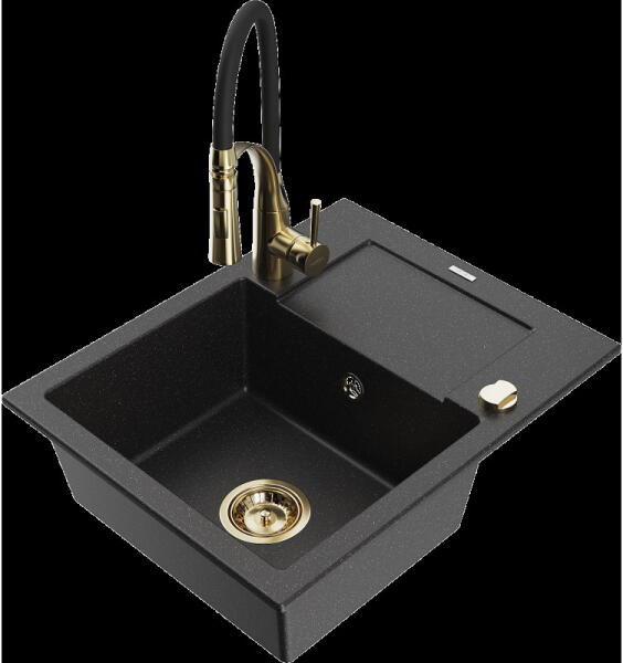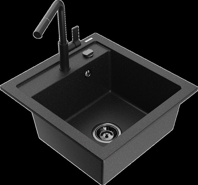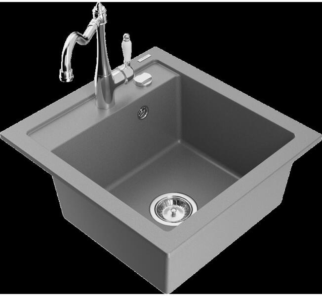 Mosogató: Gyártó: Mexen Sorozat: Vito Modell: 1 kamrás Felszerelés: munkalapra Felület típusa : sima Hossza 490 mm Szélesség 520 mm Magasság: 210 mm Kamra mélysége: 200 mm Kamra mérete: 410x360 mm Lefolyó átmérője: 90 mm Szifon + automatikus leeresztő csavar Anyaga: gránit (80% gránit - kő, 20% gyanta) Megnövelt ellenállás az ütésekkel, karcolásokkal, elszíneződésekke