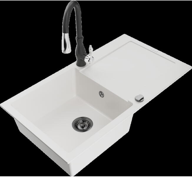 Mexen Milo, gránit mosogató 435x410x171 mm, 1 kamrás és mosogató csaptelep Carla, fehér, 6505-20-670700-20 Milo konyhai mosogató: Gyártó: Mexen Fehér szín Méretek: 435x410x171 mm Kamra mélysége: 161 mm Kamra méretei: 375x280 mm Lefolyó átmérője: ø90 mm Típus: 1 kamrás Beépítés: felülről a pultba süllyesztve Anyaga: gránit (80% gránit adalékanyag 20% gyanta) Túlfoly