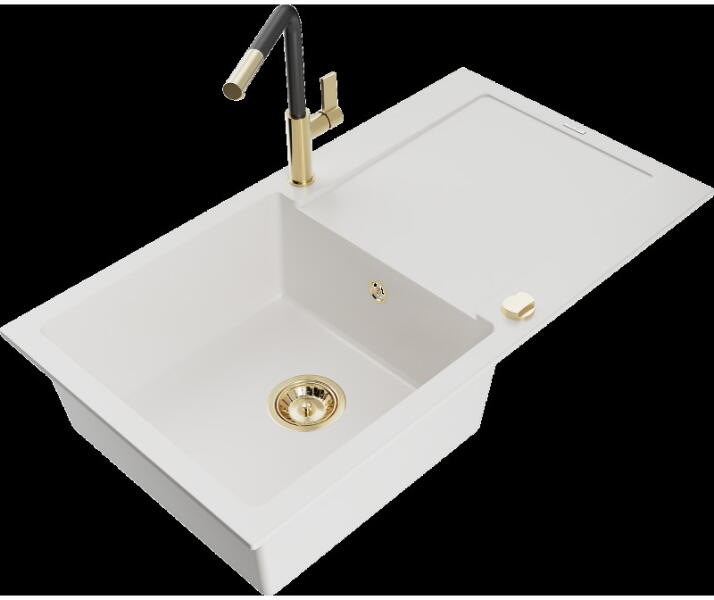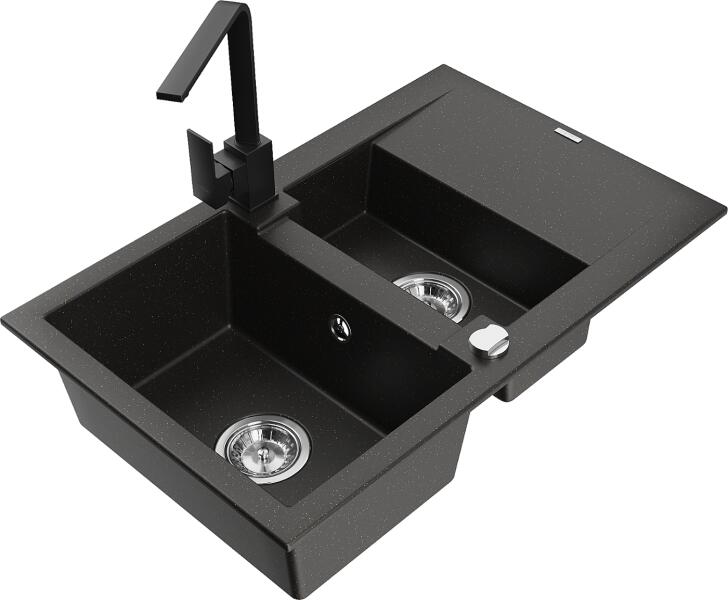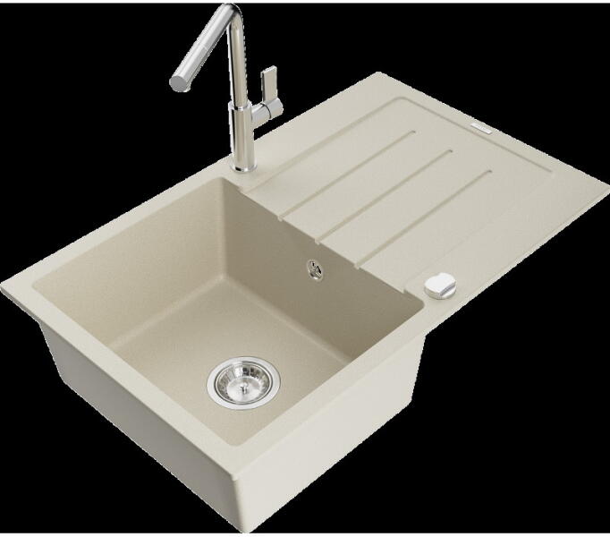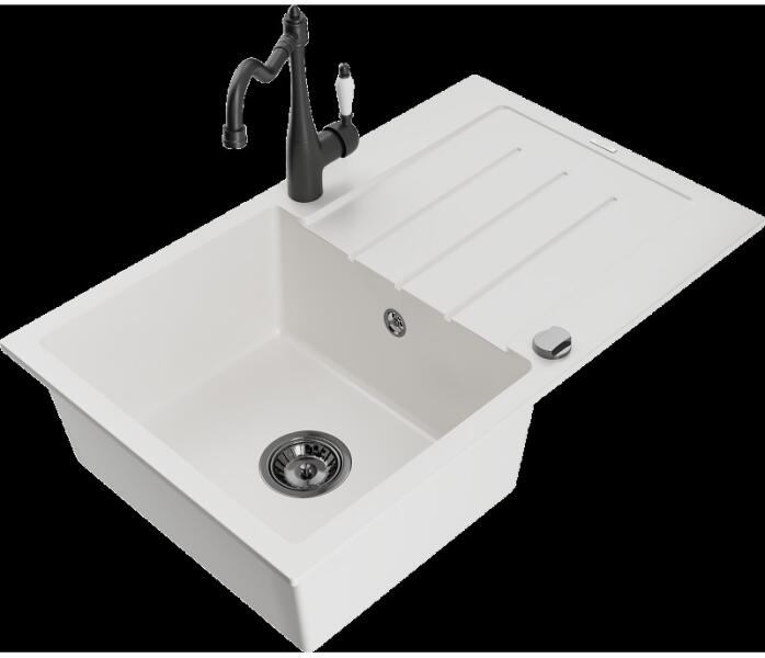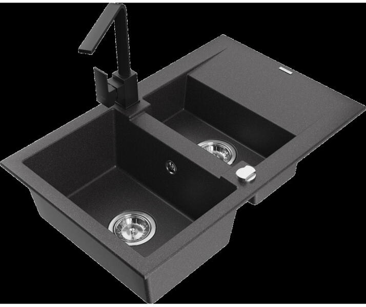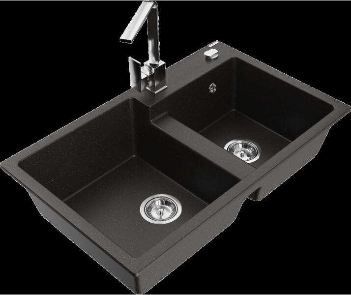Mario konyhai mosogató: Méretek: 820x436x161 mm Kamra mélysége: 151 mm Kamra méretei: 356x336 mm Lefolyó átmérője: ø90 mm Típus: 2 kamrás Típus: felülről a munkalapba süllyesztve Anyaga: gránit (80% gránit adalékanyag 20% gyanta) Túlfolyó lyuk: igen Lyukak: 2 (1 x mosogató csaptelep, 1 x automatikus leeresztő csavar vezérlés) Nagy ellenállás a karcolásokkal és el