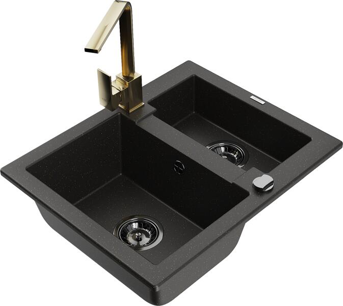 Mexen Carlos, 1,5 kamrás gránit mosogató vízelvezetővel 582x475x177 mm és Rita arany konyhai csaptelep, fekete - arany metál, 6518-75-670300-50-B Műszaki adatok: Gyártó: Mexen Sorozat: Carlos Modell: 1,5-kamrás csepptálca nélkül Felszerelés: munkalapra Szín: fekete - arany metál Hossza 582 mm Szélesség 475 mm Magasság: 177 mm Kamra mélysége: 162 mm (nagyobb), 102 mm (kisebb)