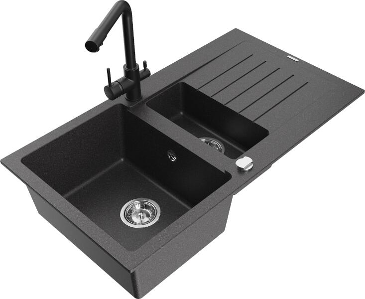 Mexen Matias, gránit mosogató 900x505x200 mm, 1,5 kamrás és fekete Duero csaptelep, fekete foltos, 6502-76-671600-70 Gyártó: Mexen Sorozat: Matias Modell: 1,5-kamrás lefolyóval Beépítés: a munkalapba való beágyazáshoz Szín: fekete foltos Felület: sima Hossza 900 mm Szélesség 505 mm Magasság: 200 mm Kamra mélysége: 180 mm (nagyobb), 115 mm (kisebb) Kamra mérete: 435x335 mm (n