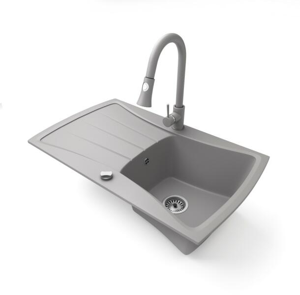 NERO Venezia gránit mosogató szürke színben. Egyedi és különleges formával tervezett egymedencés mosogató, kellően nagyméretű csepegtető résszel. A velencei gondolákat idéző, harmonikusan kialakított ívekkel a konyha esztétikus része, emellett anyagvastagságának köszönhetően rendkívül masszív konsktrukció. A mosogatón 2 lyuk található, egy a csaptelepnek és egy a