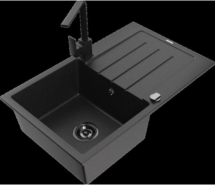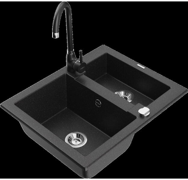 Mexen Tomas, gránit mosogató 800x500x190 mm, 2 kamrás és króm csaptelep Telma, fekete, 6516-77-670200-00 A konyhai mosogató műszaki adatai: Gyártó: Mexen Sorozat: Tomas Modell: 2-kamrás csepptálca nélkül Felszerelés: munkalapra Fekete szín Felület: sima Hossza 800 mm Szélesség 500 mm Magasság: 190 mm Kamra mélysége: 180 mm (nagyobb), 180 mm (kisebb) Kamra mérete: 440x387 mm