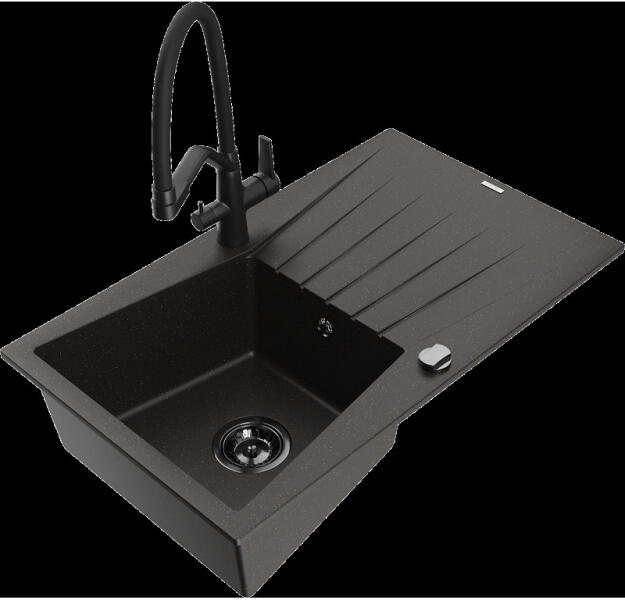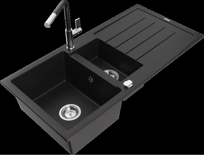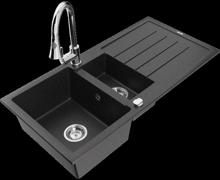 Mario konyhai mosogató: Méretek: 820x436x161 mm Kamra mélysége: 151 mm Kamra méretei: 356x336 mm Lefolyó átmérője: ø90 mm Típus: 2 kamrás Típus: felülről a munkalapba süllyesztve Anyaga: gránit (80% gránit adalékanyag 20% gyanta) Túlfolyó lyuk: igen Lyukak: 2 (1 x mosogató csaptelep, 1 x automatikus leeresztő csavar vezérlés) Nagy ellenállás a karcolásokkal és el
