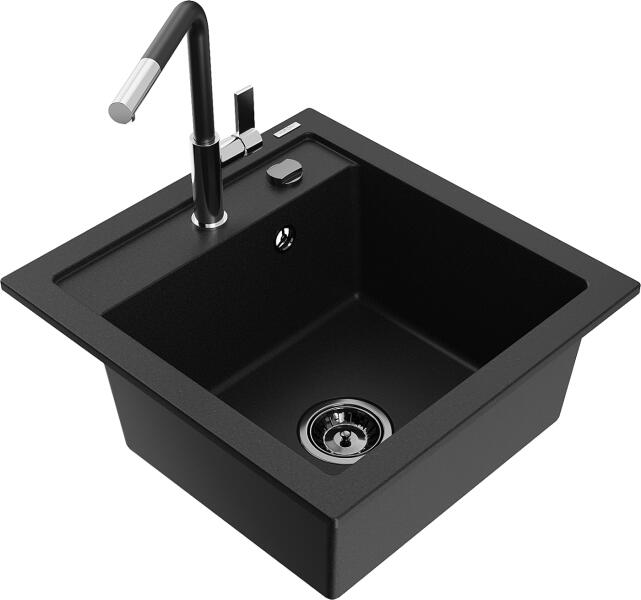 Mosogató: Gyártó: Mexen Sorozat: Vito Modell: 1 kamrás Felszerelés: munkalapra Felület típusa : sima Hossza 490 mm Szélesség 520 mm Magasság: 210 mm Kamra mélysége: 200 mm Kamra mérete: 410x360 mm Lefolyó átmérője: 90 mm Szifon + automatikus leeresztő csavar Anyaga: gránit (80% gránit - kő, 20% gyanta) Megnövelt ellenállás az ütésekkel, karcolásokkal, elszíneződésekke