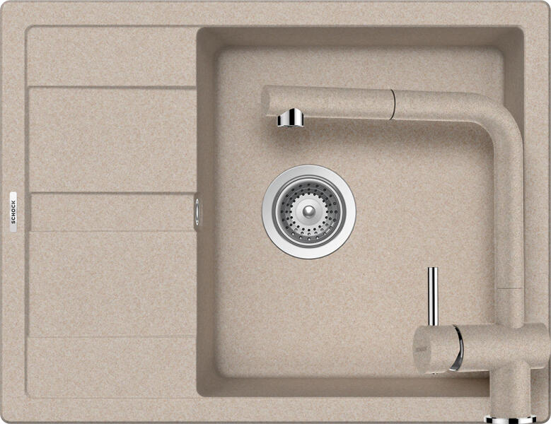 Schock Ronda D-100L konyhai mosogatótálca Cristalite Sabbia 650 x 500 mm, gránit, megfordítható, hagyományos beépítés, homok munkalapba beépíthető, egymedencés, megfordítható, csepegtetővel ellátott, ideálisan illeszkedik a minimum 50 cm-es alsószekrényhez. A csaptelep helye előre elkészített, könnyedén áttörhető. A csomagban találja a használati útmutatót, amely r
