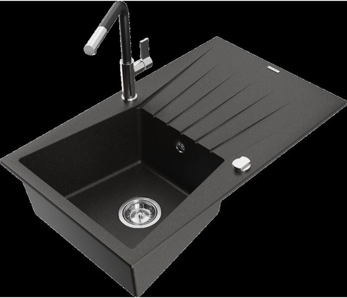 Mexen Enzo, gránit mosogató 576x465x174 mm, 1 kamrás és mosogató csaptelep Carla, fekete, 6506-77-670700-70-B Gyártó: Mexen Sorozat: Enzo Modell: 1 kamrás, rövid csepegtetővel Beépítés: felülről a munkalapba süllyesztve Hossza 576 mm Szélesség 465 mm Magasság: 174 mm Fekete szín Kamra mélysége: 164 mm Kamra mérete: 395x320 mm Szifon + automatikus leeresztő csavar Anyaga: gr
