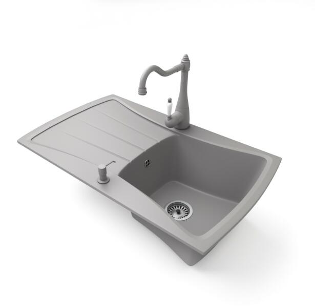 NERO Venezia gránit mosogató szürke színben. Egyedi és különleges formával tervezett egymedencés mosogató, kellően nagyméretű csepegtető résszel. A velencei gondolákat idéző, harmonikusan kialakított ívekkel a konyha esztétikus része, emellett anyagvastagságának köszönhetően rendkívül masszív konsktrukció. A mosogatón 2 lyuk található, egy a csaptelepnek és egy a