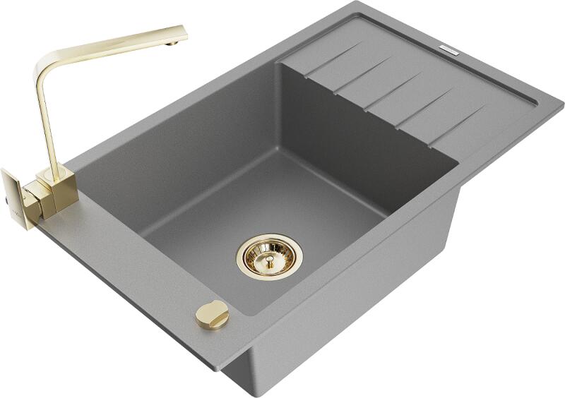 Mexen Elias, gránit mosogató gránit 795x480x200 mm, 1 kamrás, szürke arany szifonnal és arany Rita mosogató csapteleppel, 6511-71-670300-50 Gyártó: Mexen Sorozat: Elias Modell: 1 kamrás, rövid leeresztővel Felszerelés: munkalapra Szín: szürke Felületkezelés: sima Hossza 795 mm Szélesség 480 mm Magasság: 200 mm Kamra mélysége: 190 mm Kamra mérete: 465x420 mm Lefolyó átmér