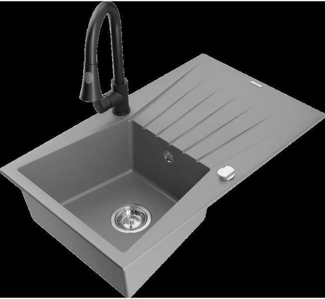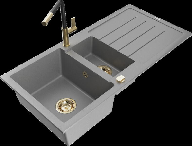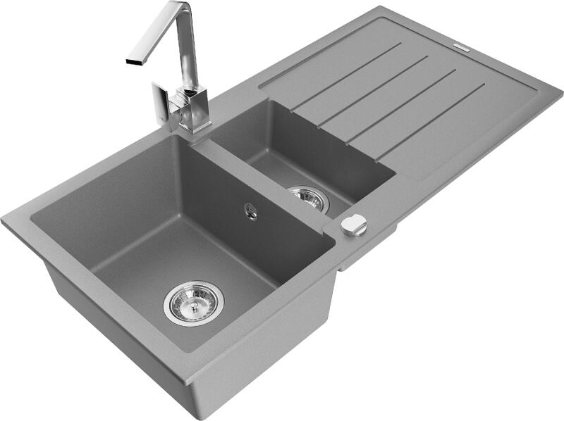 Mexen Andres, gránit mosogató 1000x500x200 mm, 1,5 kamrás, szürke króm szifonnal és Rita króm mosogató csaptelep, 6515-71-670300-00 Gyártó: Mexen Sorozat: Andres Modell: 1,5-kamrás lefolyóval Felszerelés: munkalapra Szín: szürke Felületkezelés : sima Hossza 1000 mm Szélesség 500 mm Magasság: 200 mm Kamra mélysége: 190 mm (nagyobb), 115 mm (kisebb) Kamra mérete: 430x330 mm (n