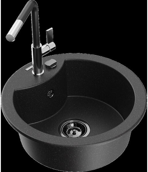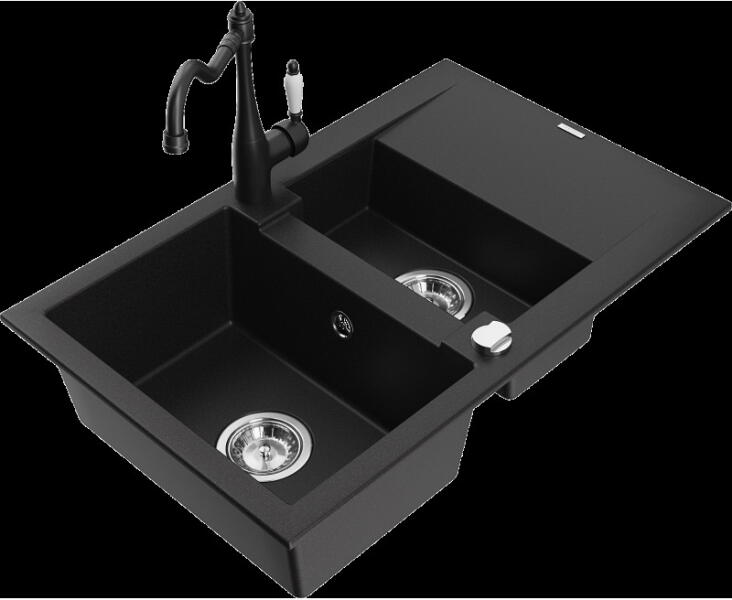 Mexen Vito, 1 kamrás gránit mosogató és Telma konyhai csaptelep, fekete, 6503-77-670200-70 Mosogató: Termékkód: 6503521000-77 Mérete: 520x490x210 mm Kamra mélysége: 200 mm Kamra méretei: 410x360 mm Lefolyó átmérője: ø90 mm Típus: 1 kamrás Típus: Az asztallapba süllyesztett Fekete szín Anyaga: gránit (80% gránit adalékanyag 20% gyanta) Túlfolyó nyílás: Igen Lyukak: (csap