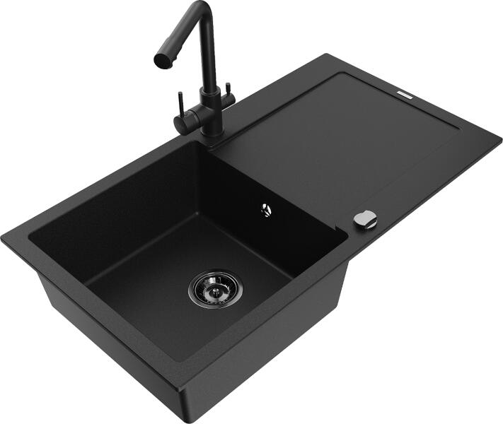 Mexen Leo, gránit mosogató 900x500x190 mm, 1 kamrás és fekete Duero csaptelep, fekete, 6501-77-671600-70-B Gyártó: Mexen Sorozat: Leo Modell: 1-kamrás s csepegtetővel Fekete szín Felület: sima Hossza 900 mm Szélesség 500 mm Magasság: 190 mm Kamra mélysége: 180 mm Kamra mérete: 430x415 mm 500 mm-es méretű szekrényekhez Szifon + automatikus leeresztő csavar Anyaga: gránit (80%