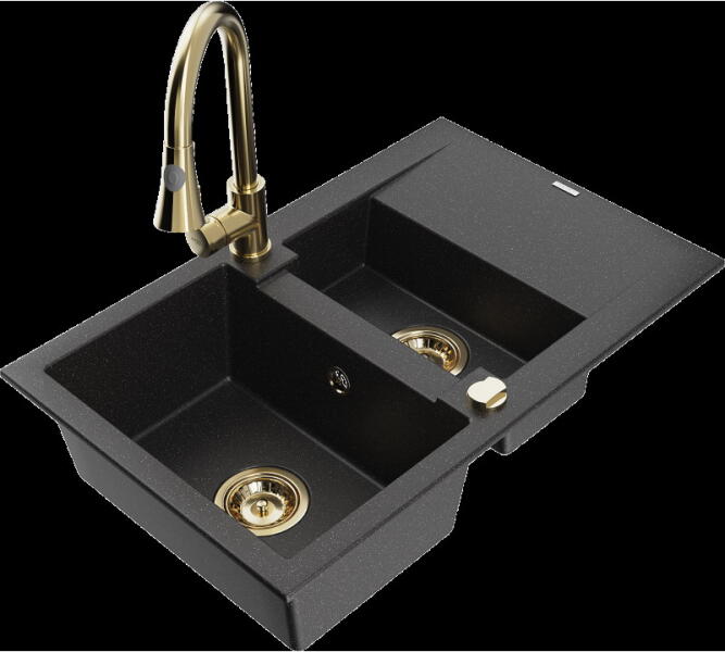 Mexen Carlos, gránit mosogató 582x475x177 mm, 1,5 kamrás és Telma arany mosogató csaptelep, fekete foltos, 6518-76-670200-50 Gyártó: Mexen Sorozat: Carlos Modell: 1,5-kamrás Beépítés: a munkalapba való beágyazáshoz Szín: fekete foltos Mérete: 582x475x177 mm Kamra mélysége: 162 mm (nagyobb), 102 mm (kisebb) Kamra méretei: 395x272 mm (nagyobb), 375x182 mm (kisebb) A lefolyó átm