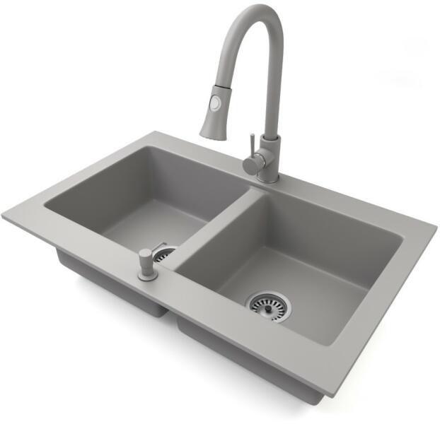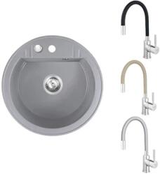 NERO Verso gránit mosogatótálca szürke színben csapteleppel és mosogatószer adagolóval. Kétmedencés, szimmetrikus elrendezésű mosogató, kellően nagyméretű medencékkel, a 75 cm-es szélesség egyszerre tágas és helytakarékos is. Letisztult formatervezés, kiemelkedő anyagvastagság jellemzi, ezáltal rendkívül masszív és ellenálló konstrukció. Anyaga 80% gránit őrlemé
