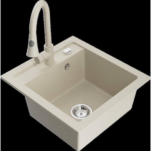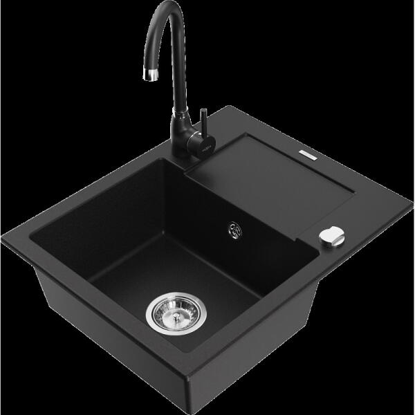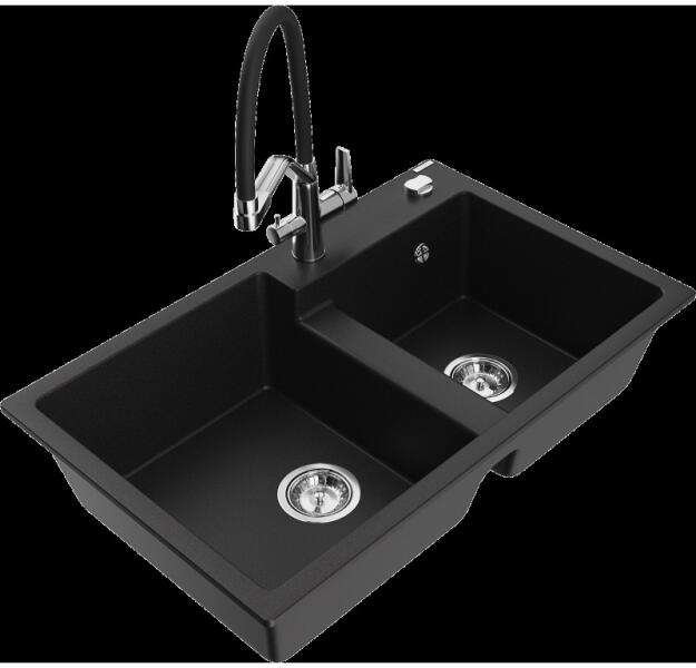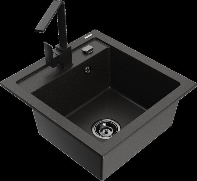 Gyártó: Mexen Sorozat: Bruno + Carla Mosogató: Szín: fekete/ezüst metál Mérete: 795x495x200 mm Kamra - mélység: 200 mm Kamra méretei: 440x360 mm Kimeneti átmérő: ø90 mm Típus: 1 kamrás csepegtetővel Mosogató típusa: a munkalapba való beágyazáshoz Anyaga: gránit (80% gránit adalékanyag 20% gyanta) Túlfolyó nyílás: Igen Lyukak: 2 (1 lyuk a mosogató csapjához, 1 lyuk az