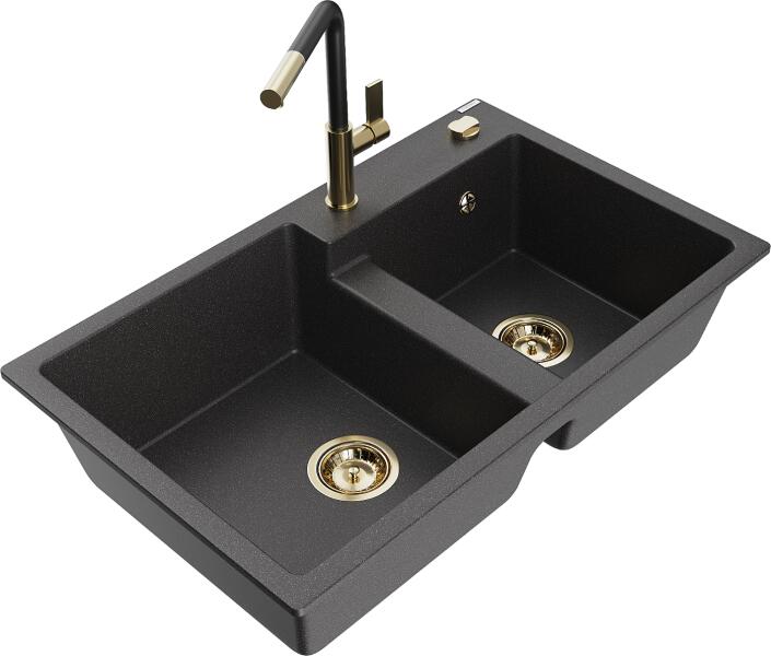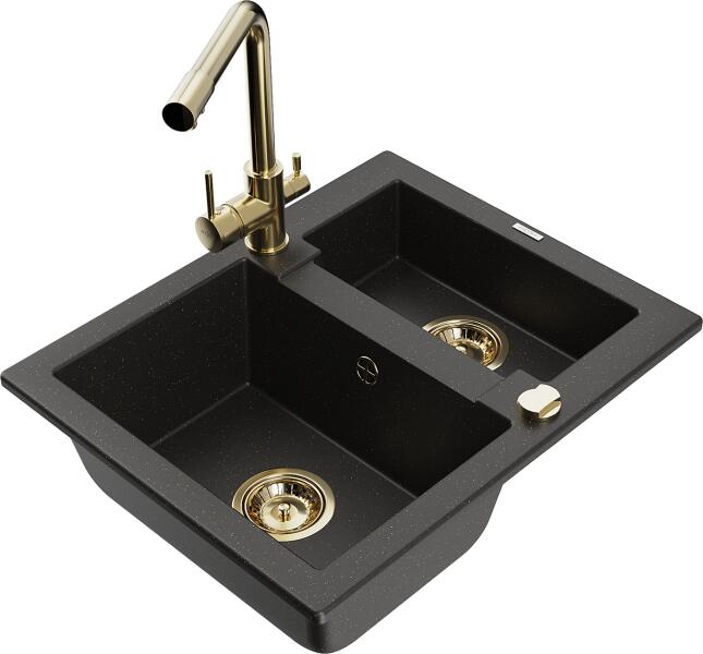 Mexen Carlos, 1,5 kamrás gránit mosogató 582x475x177 mm és Duero mosogató csaptelep, fekete-arany metál, 6518-75-671600-50 Mexen Carlos konyhai mosogató: Gyártó: Mexen Sorozat: Carlos Modell: 1,5-kamrás Beépítés: felülről a munkalapba süllyesztve Méretek: 582x475x177 mm Kamra mélysége: 162 mm (nagyobb), 102 mm (kisebb) Kamra mérete: 395x272 mm (nagyobb), 375x182 mm (kisebb) Lef