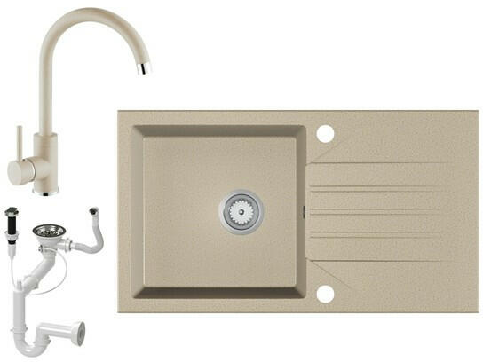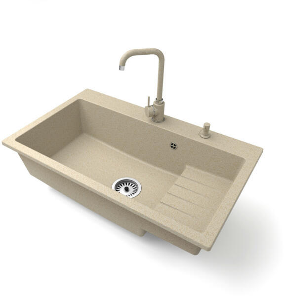 EOS Evinion gránit mosogató homokbézs színben. Megfordítható, így a mosogató medence kerülhet a bal- és a jobb oldalra is. A mosogatón 2 lyuk található egy a csaptelepnek és egy a beépíthető mosogatószer adagolónak vagy automata dugókiemelőnek. Összetétele 80% gránit őrlemény és 20% akril, ami megfelel a szabvány gránit mosogató összetételnek. Beépíthető 60 cm sz
