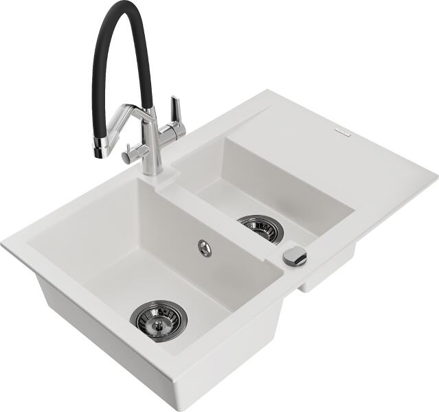 Tomas konyhai mosogató: Gyártó: Mexen Sorozat: Tomas Modell: 2-kamrás csepptálca nélkül Beépítés: felülről a munkalapba süllyesztve Hossz: 800 mm Szélesség: 500 mm Magasság: 190 mm Kamra mélysége: 180 mm (nagyobb), 180 mm (kisebb) Kamra mérete: 440x387 mm (nagyobb), 370x303 mm (kisebb) A lefolyó átmérője: Ø 90 mm Szifon + automatikus leeresztő csavar Anyaga: gránit (80% g