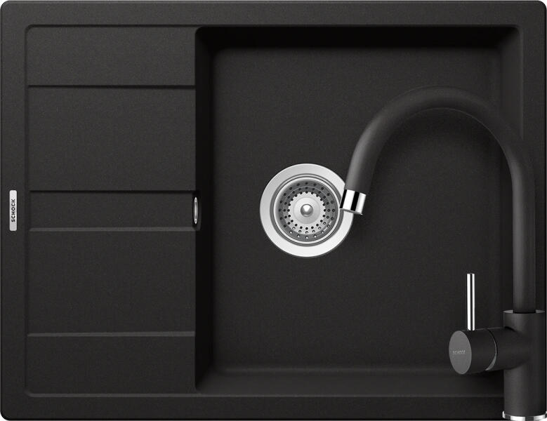 Schock Ronda D-100L konyhai mosogatótálca Cristalite Nero 650 x 500 mm, gránit, megfordítható, hagyományos beépítés, fekete munkalapba beépíthető, egymedencés, megfordítható, csepegtetővel ellátott, ideálisan illeszkedik a minimum 50 cm-es alsószekrényhez. A csaptelep helye előre elkészített, könnyedén áttörhető. A csomagban találja a használati útmutatót, amely ré