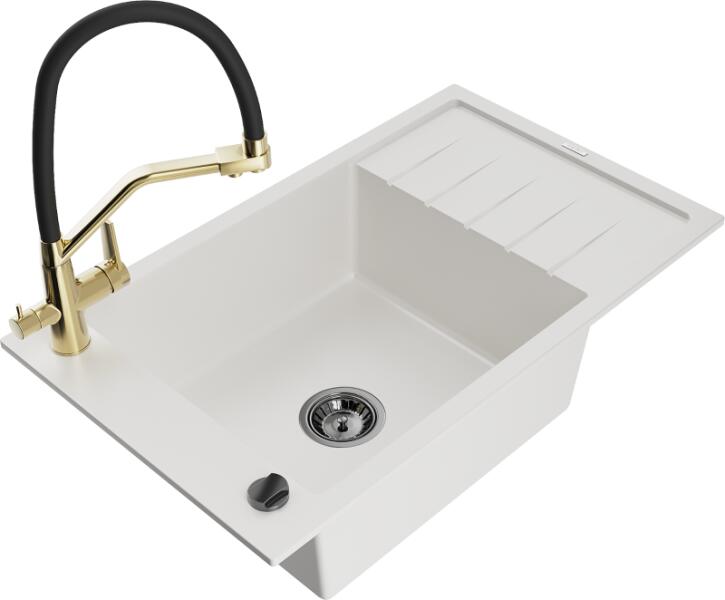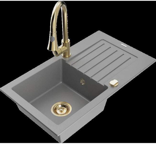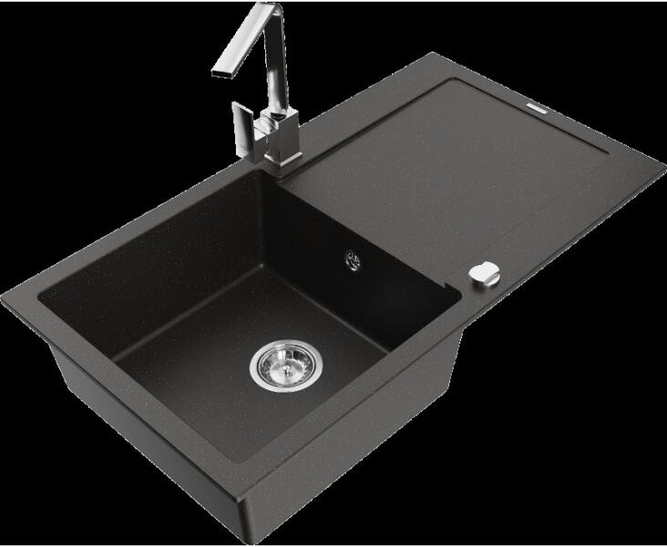 Elias konyhai mosogató, 795x480x200 mm, 1 kamrás Gyártó: Mexen Sorozat: Elias Típus: 1 kamrás, rövid csepegtetővel Méretek: 795x480x200 mm Kamra mélysége: 190 mm Kamra méretei: 465x420 mm Lefolyó átmérője: ø90 mm Beépítés: felülről a munkalapba süllyesztve Anyaga: gránit (80% gránit adalékanyag 20% gyanta) Túlfolyó lyuk: igen Lyukak: 2 (1 x akkumulátor, 1 x autom