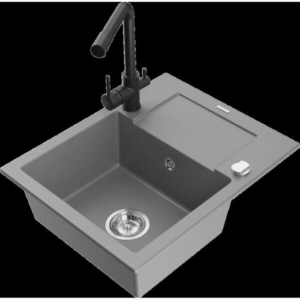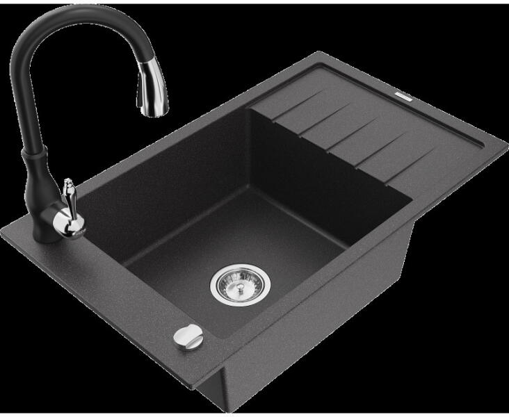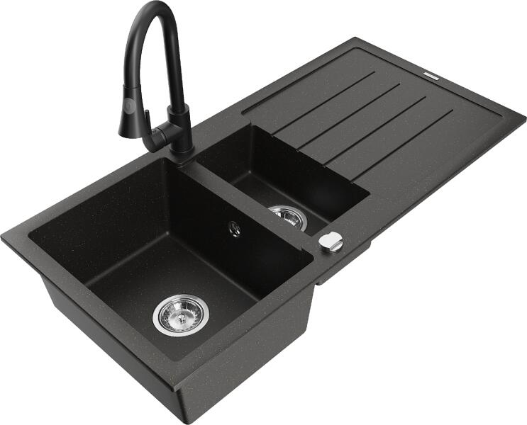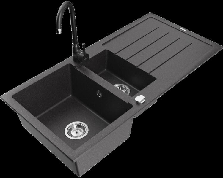 Mosogató: Gyártó: Mexen Sorozat: Andres Méretek: 1000x500x200 mm Kamra mélysége: 190 mm (nagyobb), 115 mm (kisebb) Kamra méretei: 430x330 mm (nagyobb), 340x170 mm (kisebb) Lefolyó átmérője: ø90 mm Típus: 1,5 kamrás csepegtetővel Típus: felülről az asztallapba való beágyazáshoz Anyaga: gránit (80% gránit adalékanyag + 20% gyanta) Túlfolyó nyílás: Igen Gyárilag előkész
