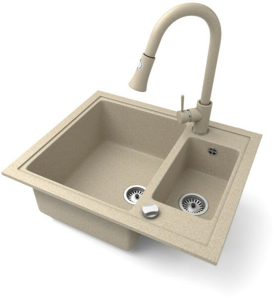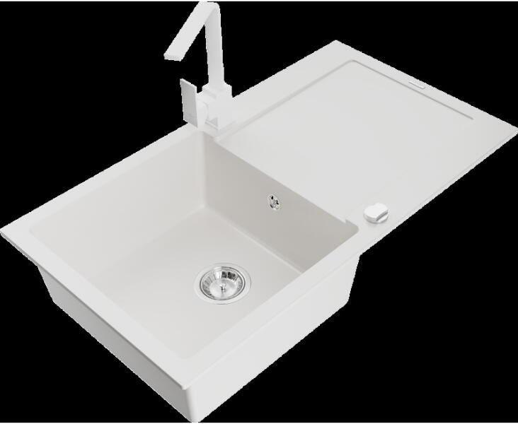 Mario konyhai mosogató: Méretek: 820x436x161 mm Kamra mélysége: 151 mm Kamra méretei: 356x336 mm Lefolyó átmérője: ø90 mm Típus: 2 kamrás Típus: felülről a munkalapba süllyesztve Anyaga: gránit (80% gránit adalékanyag 20% gyanta) Túlfolyó lyuk: igen Lyukak: 2 (1 x mosogató csaptelep, 1 x automatikus leeresztő csavar vezérlés) Nagy ellenállás a karcolásokkal és elszíne