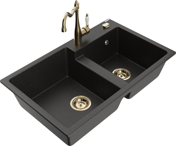 Mexen Tomas, gránit mosogató 800x500x190 mm, 2 kamrás és mosogató csaptelep Carla, fekete-arany metál, 6516-75-670700-50 A konyhai mosogató műszaki adatai: Gyártó: Mexen Sorozat: Tomas Modell: 2-kamrás csepptálca nélkül Beépítés: a munkalapba való beágyazáshoz Szín: fekete/arany metál Felület: sima Hossza 800 mm Szélesség 500 mm Magasság: 190 mm Kamra mélysége: 180 mm