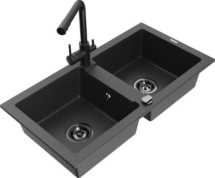 Mexen Mario, 2-kamrás gránit mosogató 820x436x161 mm és Duero fekete mosogató csaptelep, fekete foltos, 6504-76-671600-70-B Gyártó: Mexen Sorozat: Mario Termékkód: 6504822000-76 Szín: fekete foltos Mérete: 820x436x161 mm Kamra mélysége: 151 mm Kamra méretei: 356x336 mm Lefolyó átmérője: ø90 mm Típus: 2 kamrás Típus: a pultba süllyesztve Anyaga: gránit (80% gránit adalékan