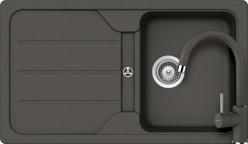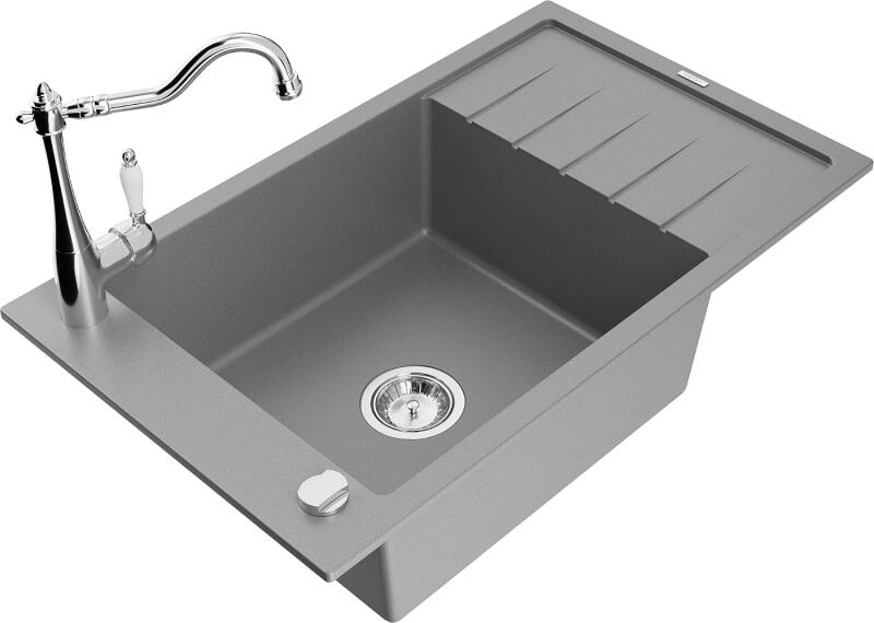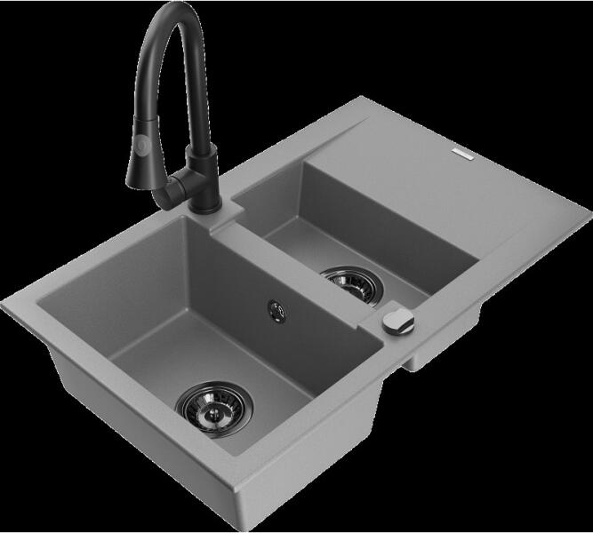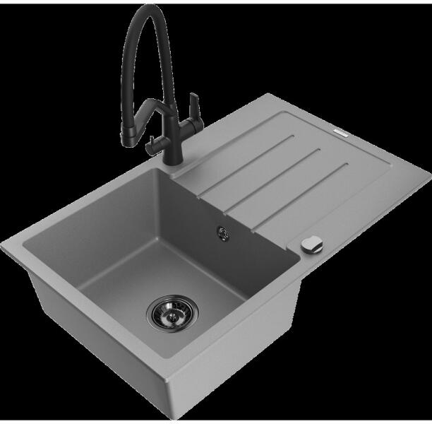 Mexen Elias, gránit mosogató 795x480x200 mm, 1 kamrás és mosogató csaptelep Carla, szürke, 6511-71-670700-00 Elias konyhai mosogató: Szín: szürke Méretek: 795x480x200 mm Kamra mélysége: 190 mm Kamra méretei: 465x420 mm Lefolyó átmérője: ø90 mm Típus: 1 kamrás, rövid csepegtetővel Beépítés: felülről a munkalapba süllyesztve Anyaga: gránit (80% gránit adalékanyag 20% g