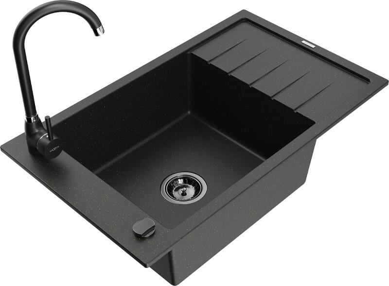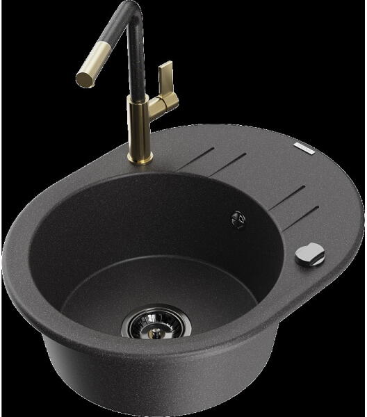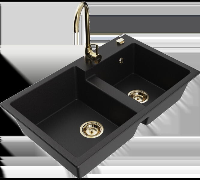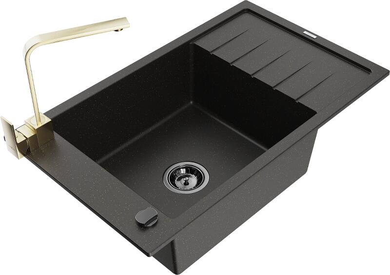 Mexen Elias, 1 rekeszes gránit mosogató lefolyóval 795x480x200 mm és fekete matt konyhai csaptelep Telma, fekete-arany metál, 6511-75-670200-70-B Elias konyhai mosogató: Termékkód: 6511791005-75 Szín: fekete - arany metál Mérete: 795x480x200 mm Kamra mélysége: 190 mm Kamra méretei: 465x420 mm Lefolyó átmérője: ø90 mm Típus: 1 kamrás, rövid csepegtetővel Típus: a pultba sül