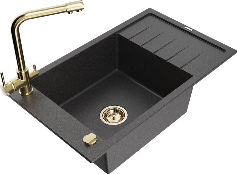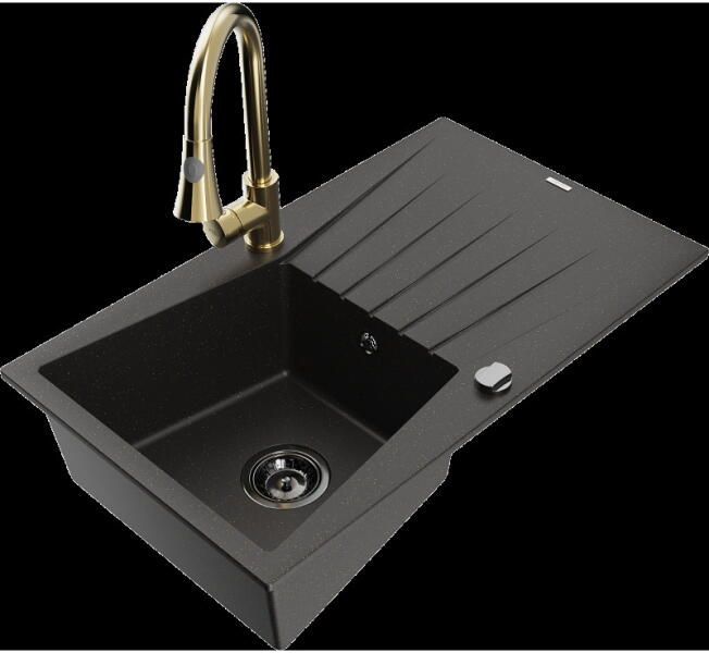 Mexen Elias, 1 rekeszes gránit mosogató lefolyóval 795x480x200 mm és Duero arany csapteleppel, fekete - foltos, 6511-76-671600-50 Elias konyhai mosogató: Szín: fekete foltos Mérete: 795x480x200 mm Kamra mélysége: 190 mm Kamra méretei: 465x420 mm Lefolyó átmérője: ø90 mm Típus: 1 kamrás, rövid csepegtetővel Típus: a pultba süllyesztve Anyaga: gránit (80% gránit adalékanyag 2