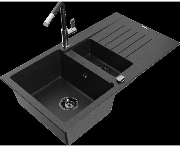 Mexen Bruno - gránit mosogató 79,5x49,5cm, 1 kamrás, fekete-ezüst, 6513791010-73 Gyártó: Mexen Sorozat: Bruno Modell: 1-kamrás s csepptálca Hossza 795 mm Szélesség 495 mm Magasság: 200 mm Kamra mélysége: 190 mm Kamra mérete: 440x360 mm Szifon + automatikus leeresztő Anyaga: gránit (80% gránit - kő, 20% gyanta) Megnövelt ütésállóság, karcolás, elszíneződés, magas hőmé
